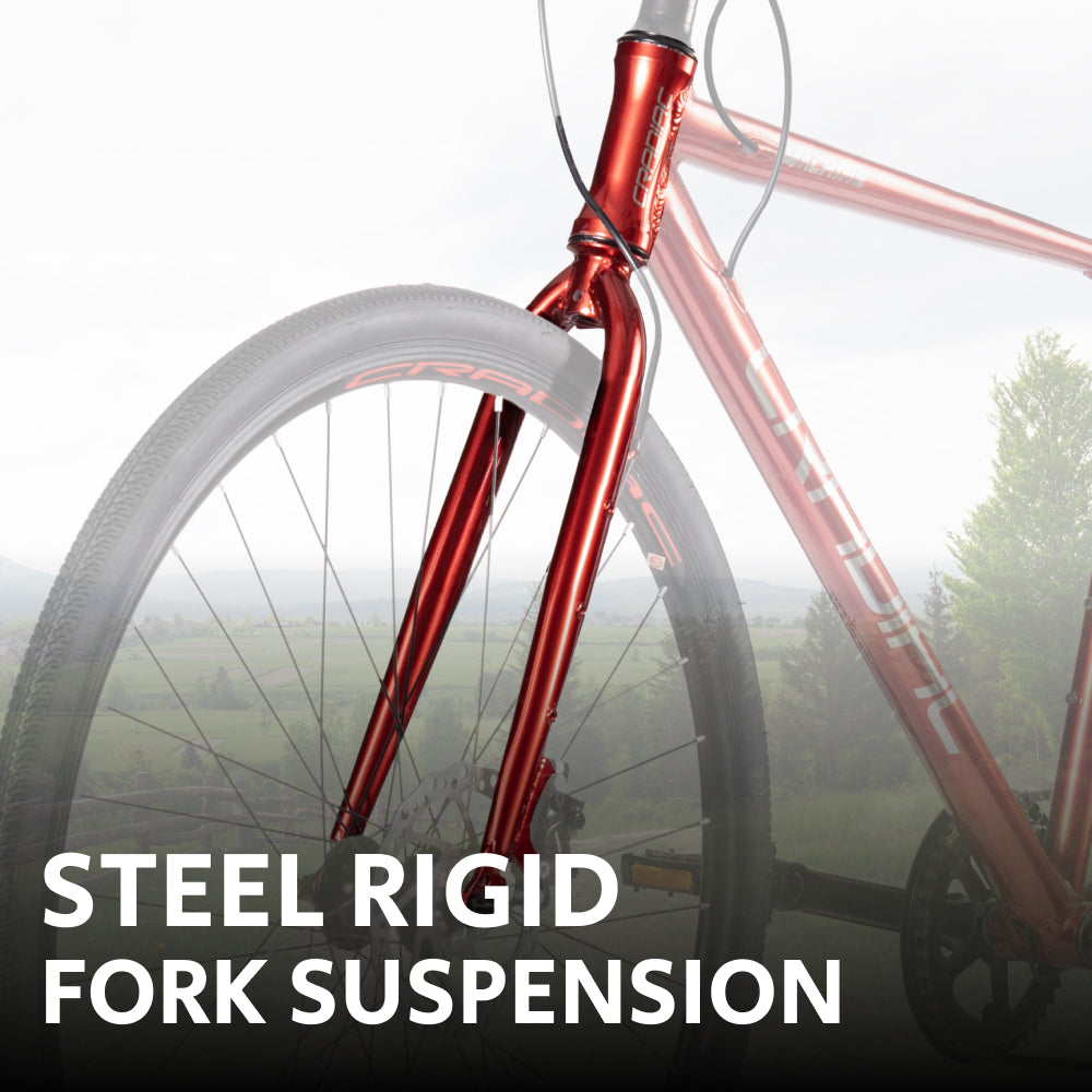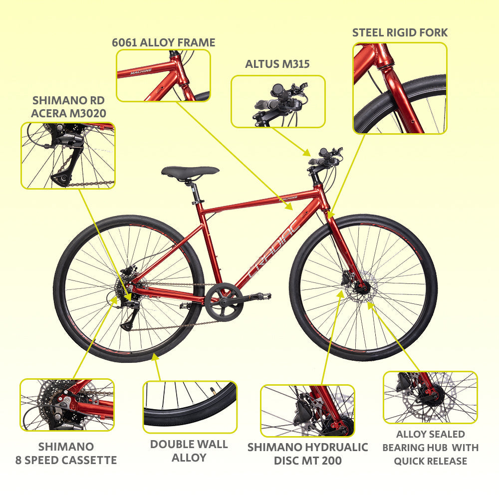 CRADIAC Machine X 8 Speed 6061 Alloy Hybrid Cycle 8 Geared Bicycle for Men with Rigid Fork & Dual Disc Brake Hybrid Bike | Ideal for 15+ Years, Unisex, Frame Size : 19.5 Inch, Metalic Red